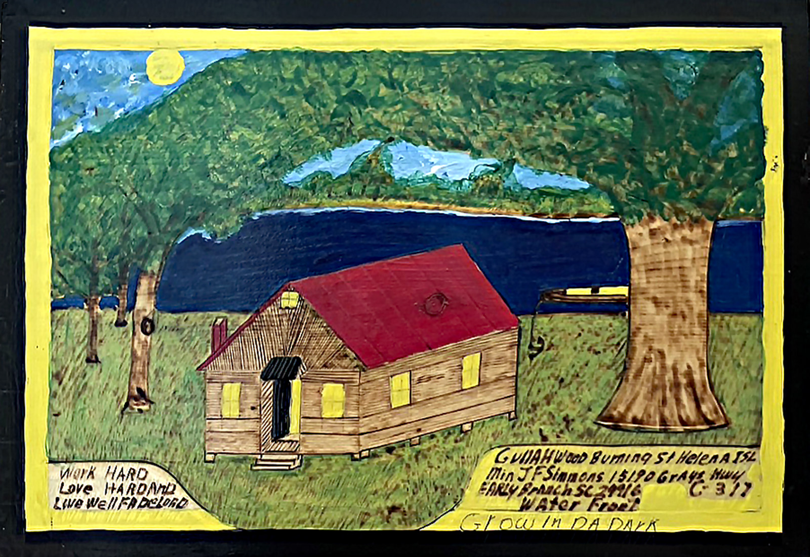 The scenes and stories in Simmons’ work are steeped in the Gullah culture of the Low Country. He writes titles and captions in the Gullah dialect, which can be both delightful and challenging. Animals often have a point of view that informs the story, calling out the foolish behavior of the humans involved. Look closely at his art and you will see that Simmons has hidden the occasional lion’s head, paying homage to the rock that started it all.